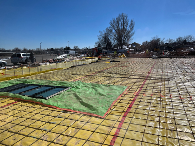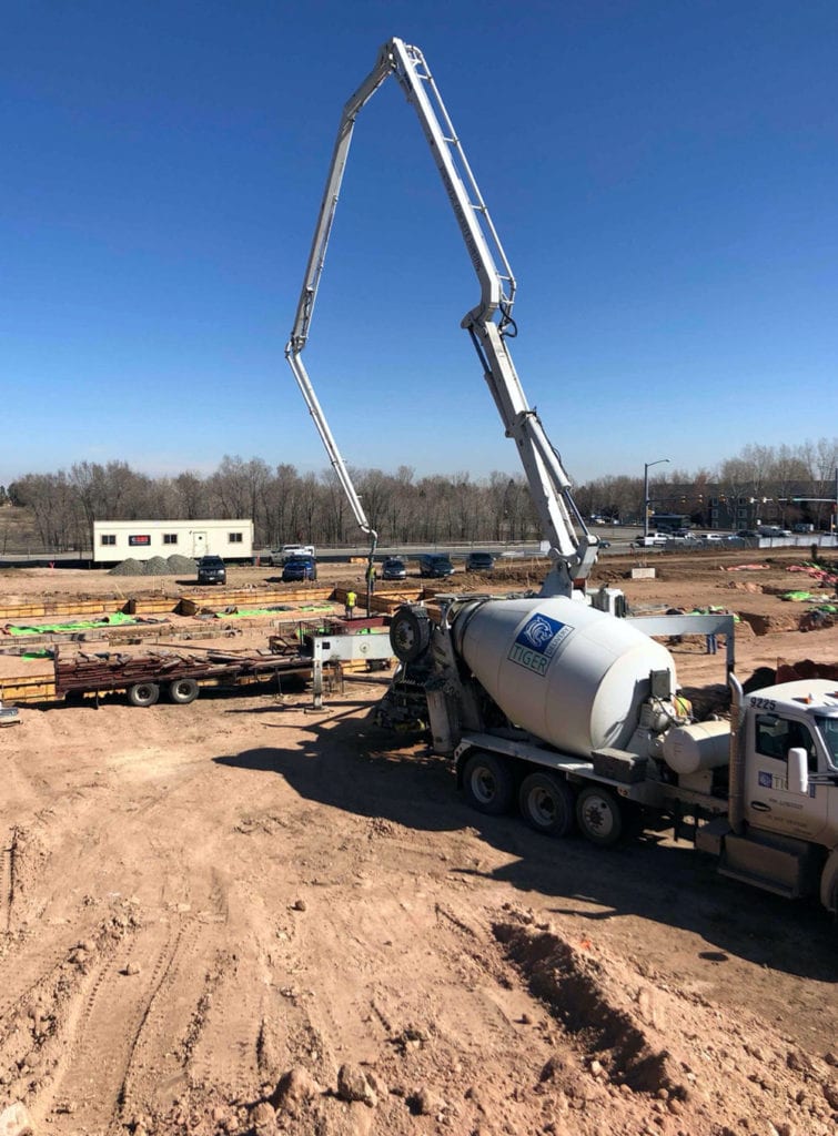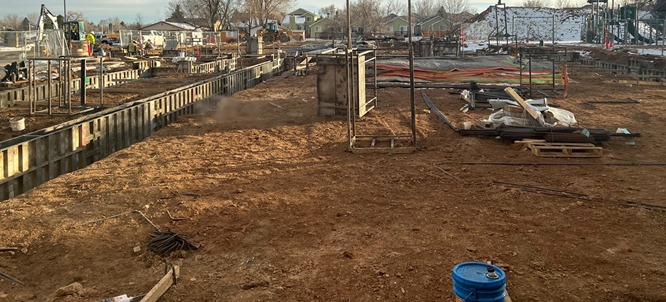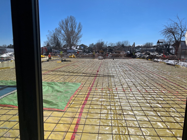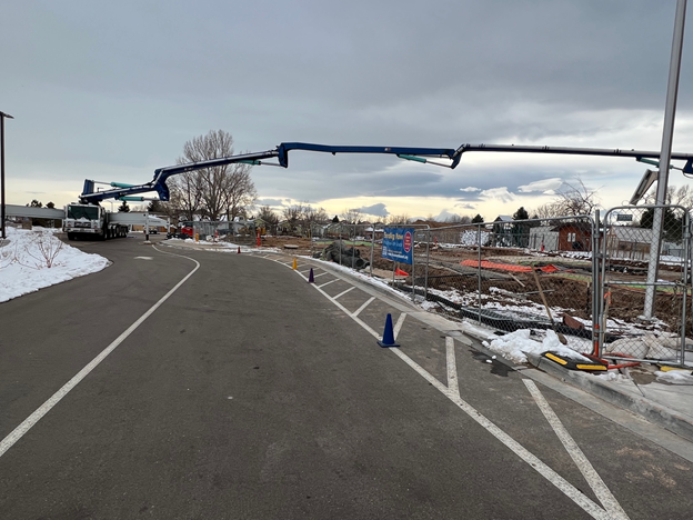 Last week the footers for the foundation were finished, without impacting our drive lane! We are fortunate for our partners at Elder Construction who were able to get creative and coordinate a way to finish the cement work without shutting down our Shields entrance. Instead, they were able to fit the pumper truck on the southernmost part of campus and reach the remaining distance, see how far it stretched!