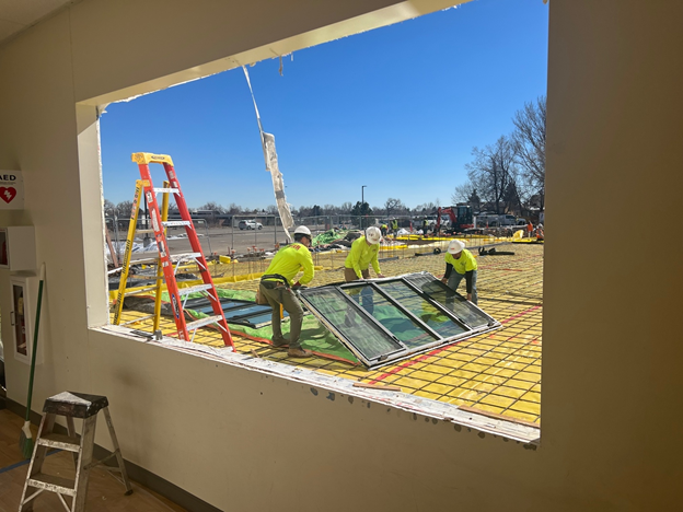 Even when the weather delayed the cement pour on Thursday, the Elder team was busy prepping for the gym. They removed the windows that will be used in another section of the building. It’s impressive how quickly they were able to take the windows out and replace them with a new wall! Check out the pictures.