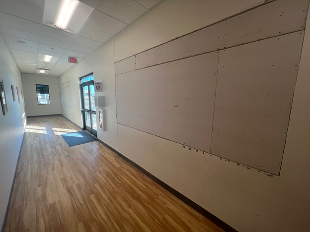 A look down the entryway from the secure vestibule and a peek into the main office.